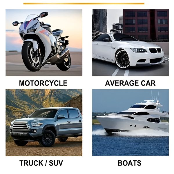 Χρησιμοποιήστε το CARCOAT σε αυτοκίνητα, σκάφη, μοτοσικλέτες, τροχόσπιτα, ATV και πολλά άλλα. Είναι ασφαλές για όλες τις επιφάνειες, συμπεριλαμβανομένων του χρώματος, του πλαστικού και του γυαλιού.
