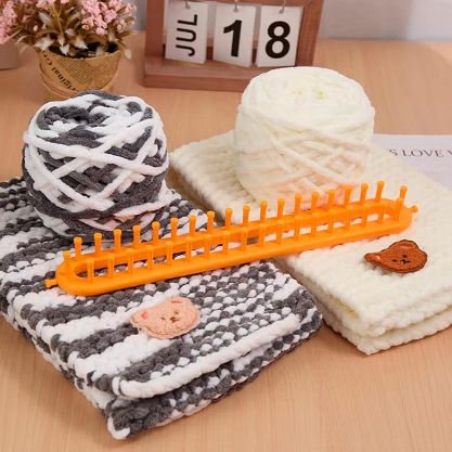 - Η συσκευασία περιέχει: 4x βοήθηματα πλεξίματος διαφορετικών μεγεθών, 1x γάντζος για την αφαίρεση του τελικού προϊόντος, 2x βελόνες, 1x οδηγίες